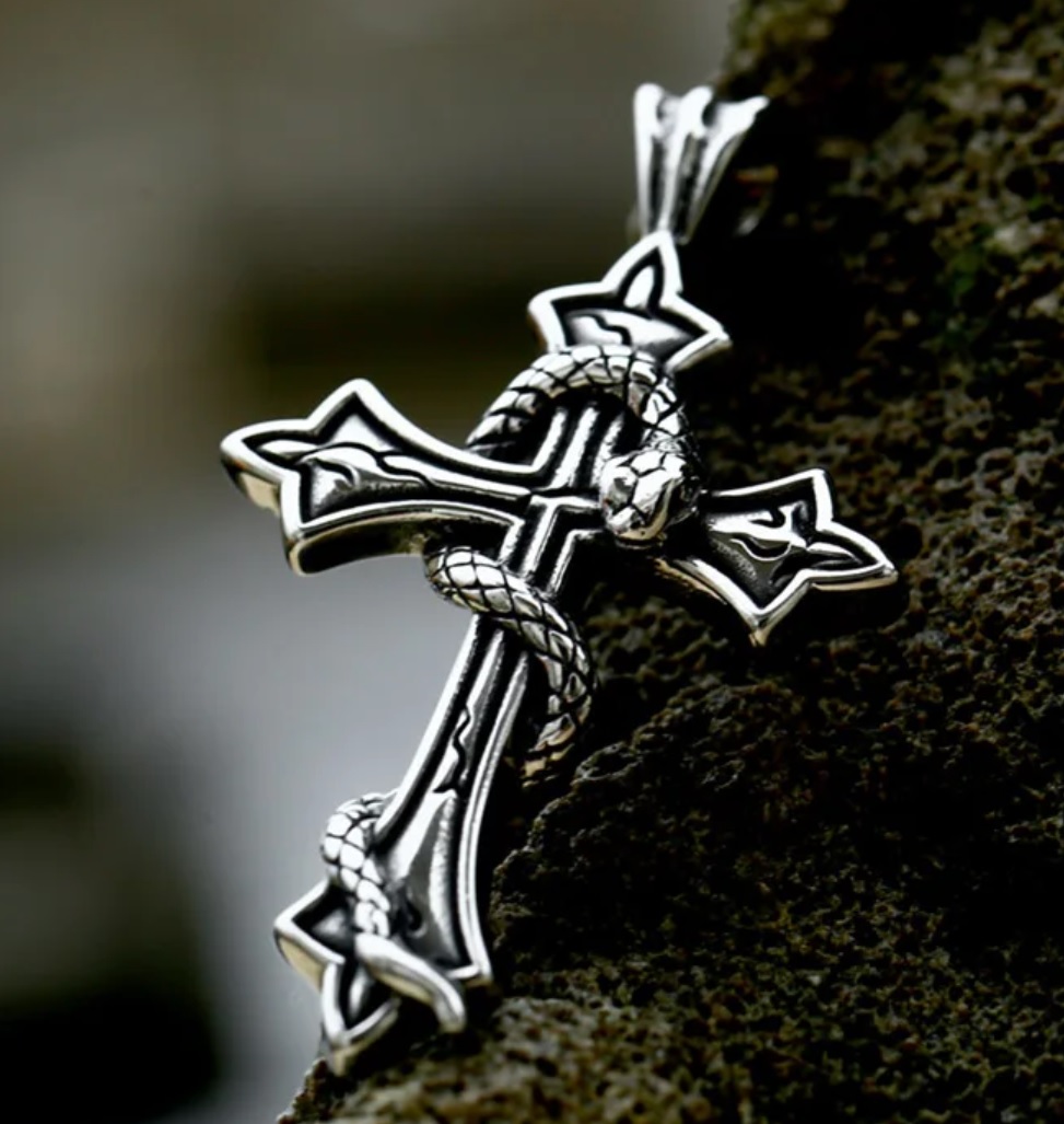 Ocelový náhrdelník a přívěsek kříž, okolo kterého je obtočený had. Hadí řetízek pro všechny milovníky těchto plazů.