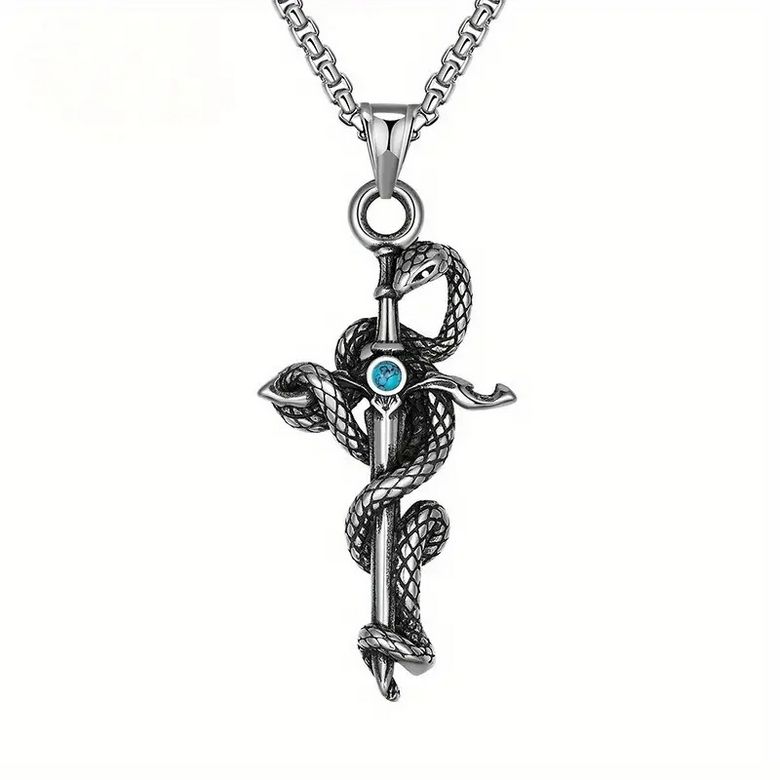 Ocelový náhrdelník a přívěsek kříž, okolo kterého je obtočený had. Hadí řetízek pro všechny milovníky těchto plazů.