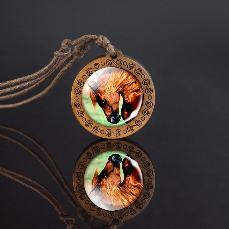 Hnědý náhrdelník a přívěšek s koněm.