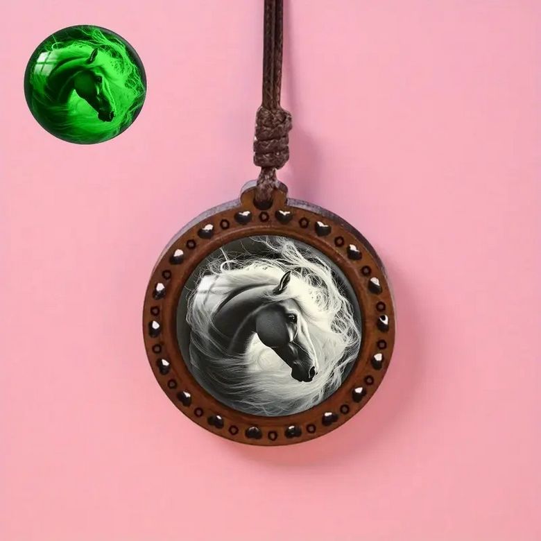 Hnědý náhrdelník a přívěšek s koněm. Obrázek po nasvícení (třeba lampičkou) svítí ve tmě.