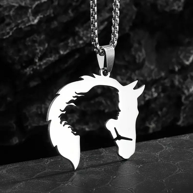 Krásný náhrdelník a přívěsek ve tvaru hlavy koně, ve které vidíme dívku. Řetízek i přívěsek kůň je stříbrné barvy a může posloužit jako skvělý dárek pro milovníky koní.