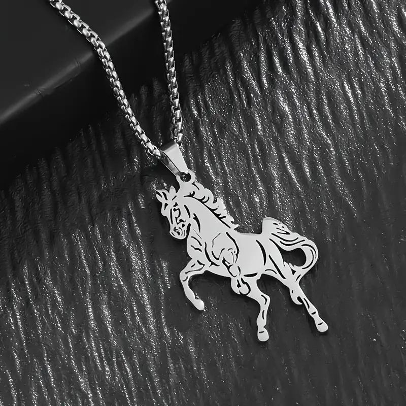 Krásný nerez ocelový náhrdelník a přívěsek s koněm, co stojí na zadních. Řetízek i přívěsek kůň je stříbrné barvy a může posloužit jako skvělý dárek pro milovníky koní.