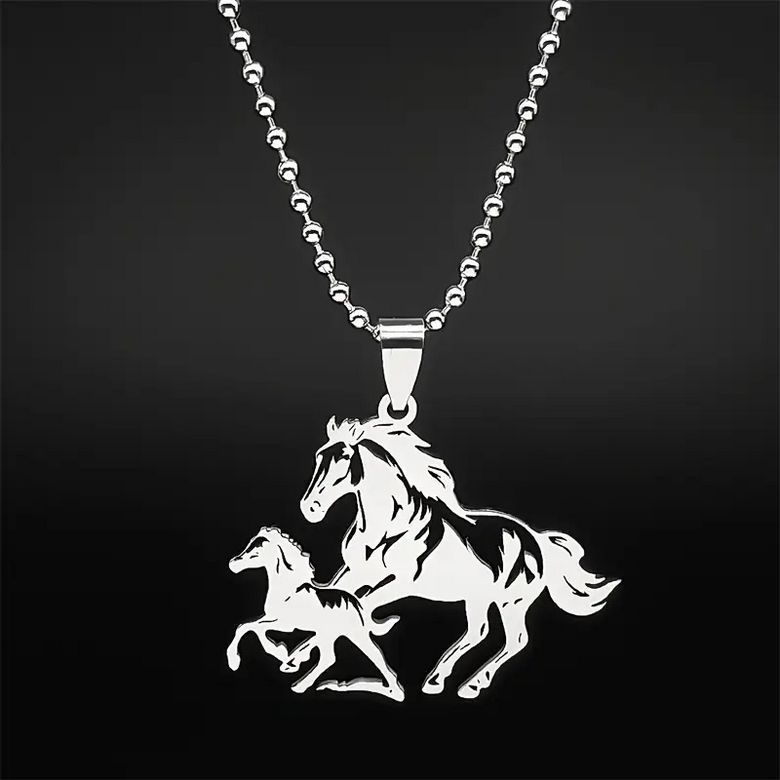 Krásný nerez ocelový náhrdelník a přívěsek s běžícím koněm a hříbětem. Řetízek i přívěsek kůň je stříbrné barvy a může posloužit jako skvělý dárek pro milovníky koní. Materiál: nerez ocel.