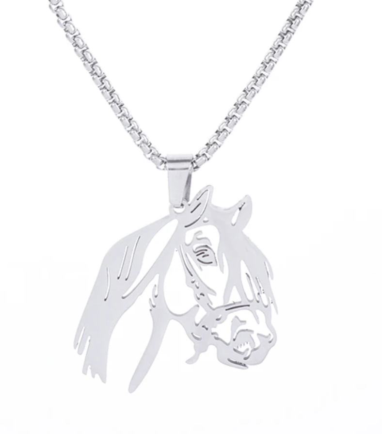 Krásný náhrdelník a přívěsek s koněm. Řetízek i přívěsek kůň je stříbrné barvy a může posloužit jako skvělý dárek pro milovníky koní.
