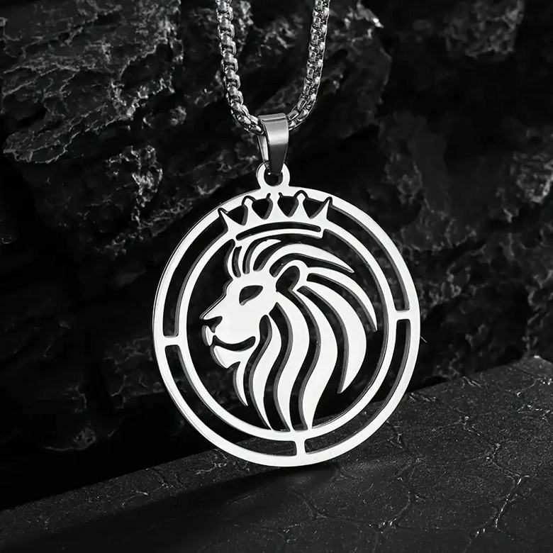 Ocelový náhrdelník a přívěsek se lvem s královskou korunou. Řetízek lev je vhodný pro všechny, kteří mají narozeniny v horkých letních měsících a jsou narození v tomto znamení zvěrokruhu, nebo pro milovníky majestátných lvů.