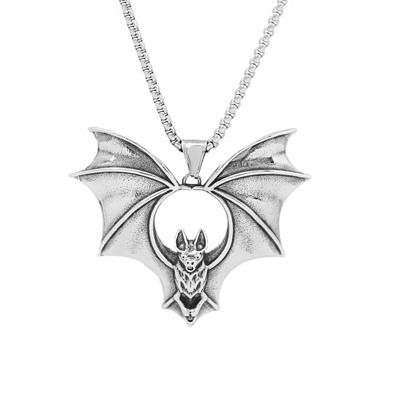 Ocelový náhrdelník a přívěšek netopýr. Netopýr je létající noční tvor, vyskytující se často v jeskyních.