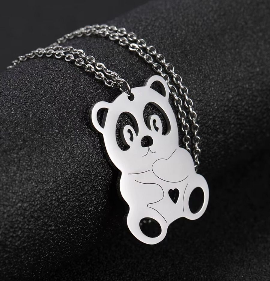 Ocelový náhrdelník s roztomilou pandou. Přívěsek pandička je stříbrné barvy a má na sobě srdíčko.