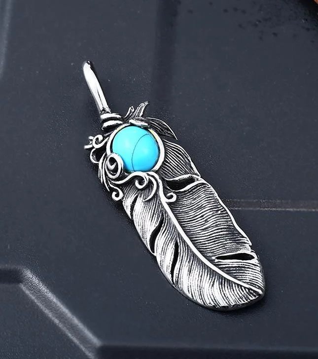 Ocelový náhrdelník (řetízek) a přívěsek s pírkem s modrým kamínkem.