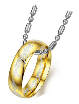 Náhrdelník a přívěsek s Prstenem Moci z Pána prstenů od Tolkiena. Prstýnek pán prstenů je zlaté barvy a vyroben z oceli. Řetízek je stříbrné barvy a taktéž ocelový.