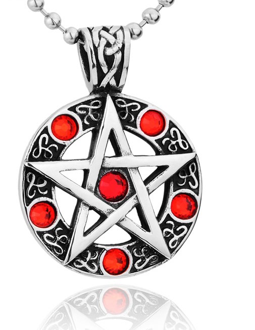 Ocelový náhrdelník a přívěsek s pentagramem s červenými krystalky.
