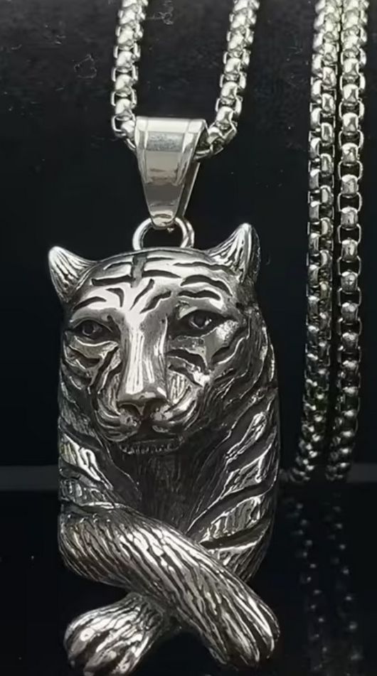 Ocelový náhrdelník a přívěsek s tygrem. Je vhodný pro všechny milovníky tohoto exotického zvířete.