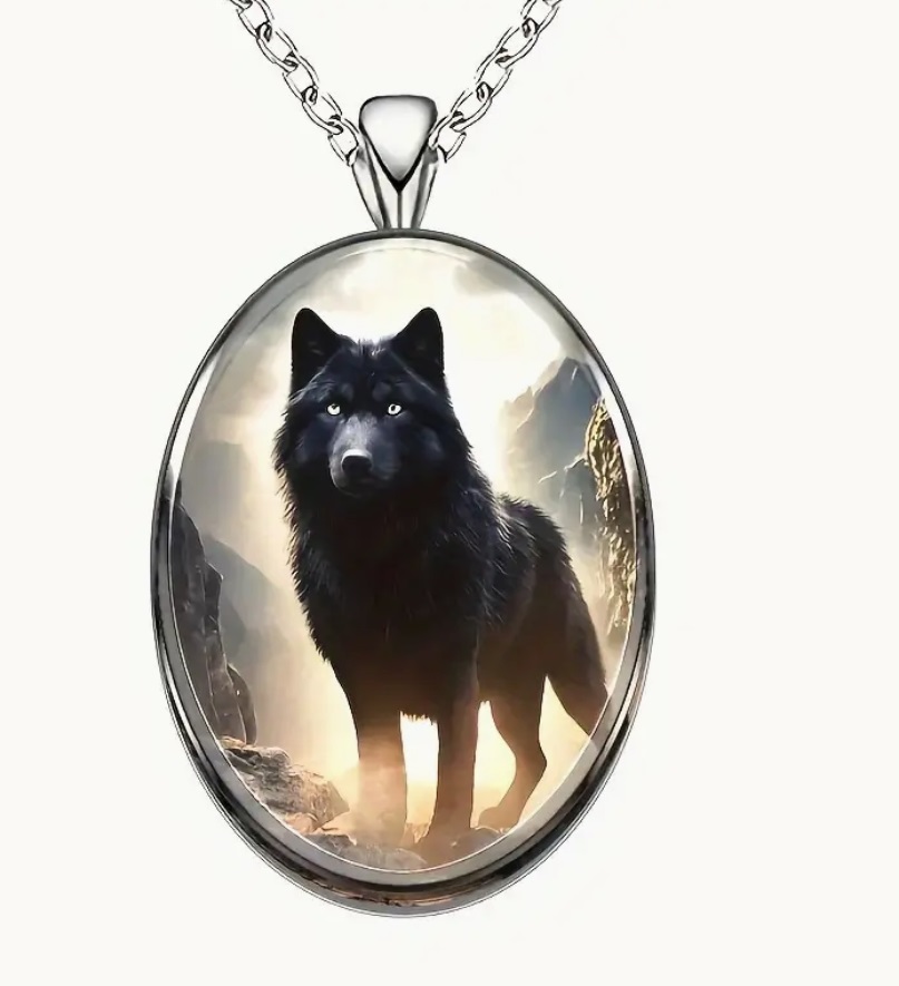 Náhrdelník a přívěsek s vlkem. Na obrázku je hrozivý černý vlk.
