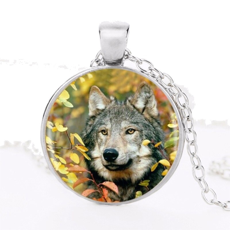 Náhrdelník a přívěsek s vlkem. Na obrázku je hlava nádherného chlupatého vlka mezi listím.