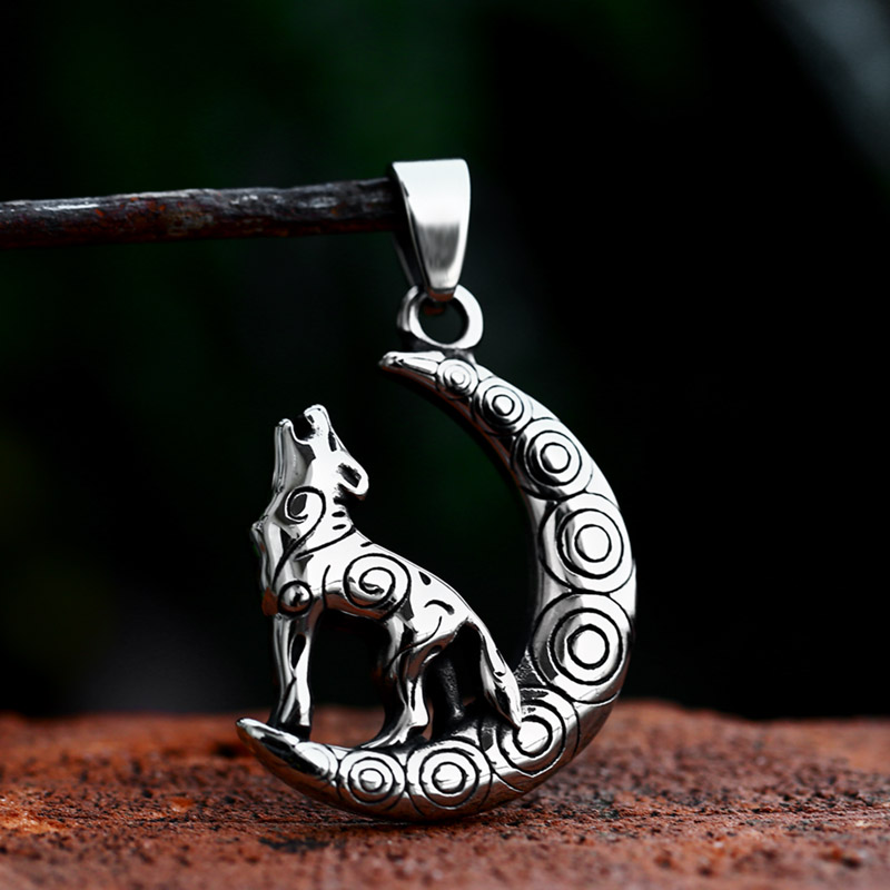 Ocelový náhrdelník a přívěsek s vlkem, který stojí na půlměsíci a vyje. Řetízek vlk je krásný doplněk, který se bude dobře vyjímat na krku každého fanouška vlků!