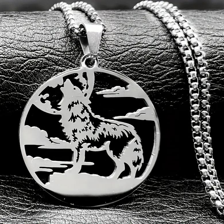 Nerez ocelový náhrdelník a přívěsek s s vlkem, co stojí na skále a vyje na měsíc. Tento řetízek vlk patří mezi věci s vlkem, které potěší každého milovníka vlků.