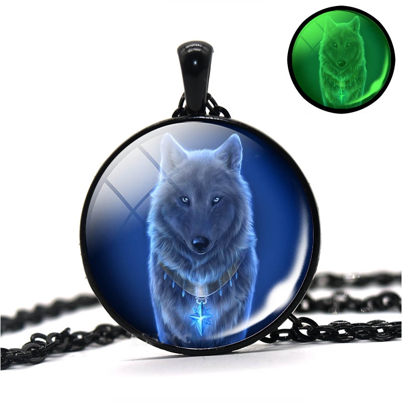 Černý náhrdelník a přívěsek s vlkem. Po nasvícení svítí ve tmě.