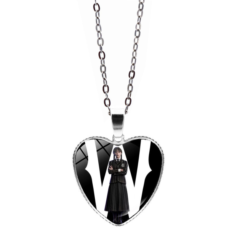 Náhrdelník a přívěsek s motivem úspěšného seriálu Wednesday. Na obrázku přívěsku vidíme hlavní postavu Wednesday Adamsovou (herečka Jenna Ortega).