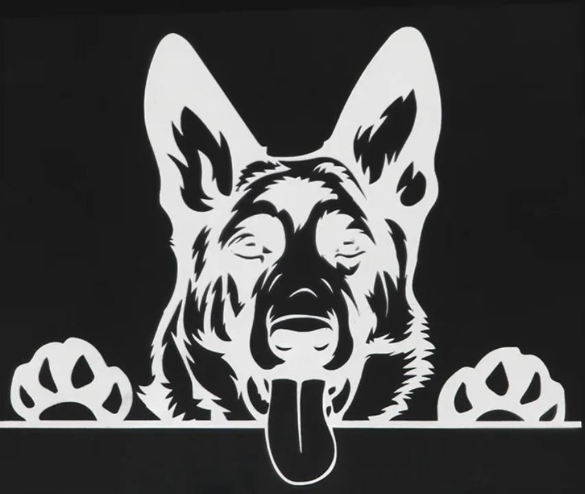 Krásná bílá samolepka s německým ovčákem. Nálepka německý ovčák je vhodná pro všechny milovníky plemene německý ovčák. Lze nalepit na notebook, auto, či jinam.