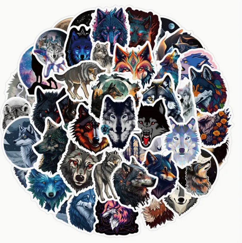 Samolepky s vlkem. Set samolepek vlk obsahuje 63 samolepek různých vlků. Na některých vidíme celého vlka, na jiných je pouze jeho hlava. Vhodné pro všechny fanoušky tohoto nádherného chlupatého zvířete, možno nalepit třeba do notýsku či na nábytek.
