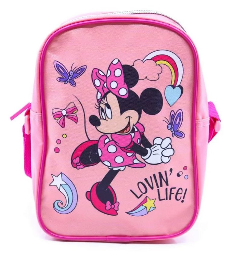 Rozkošná dětská taška přes rameno myška Minnie Mouse. Kabelka je růžové barvy, je na ní parádnice myška Minnie v roztomilých růžových šatičkách a mašlí na hlavě. Okolo ní josu obrázky jako druha, srdíčko, motýlek aj.