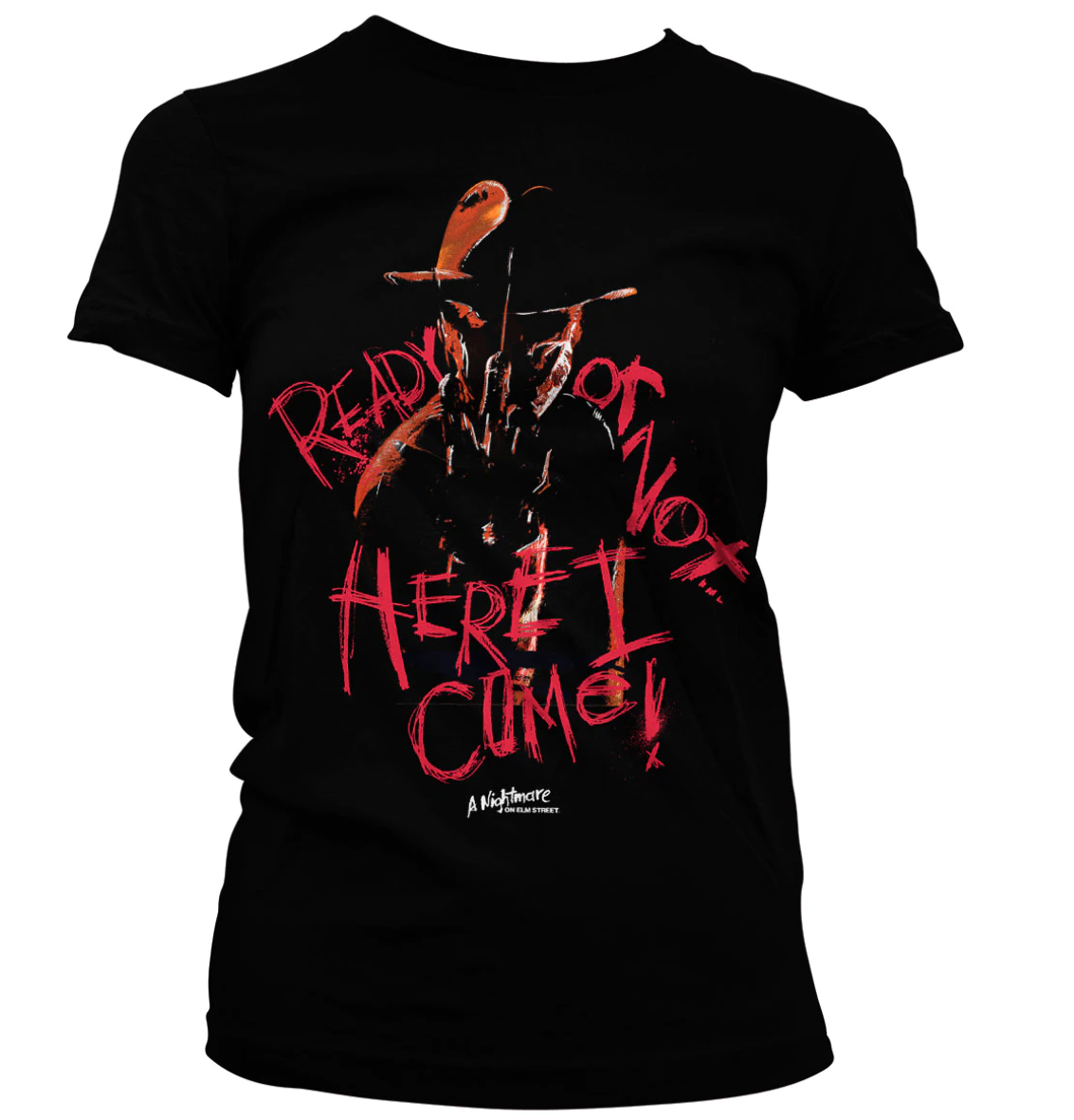 Oficiálně licencované hororové dámské tričko Nightmare on Elm Street (Noční můra v Elm Street) - vrah Freddy Krueger. Triko je černé barvy a má krátký rukáv. Na tričku je nápis Ready or not here I come. Nezbytný doplněk do šatníku každého hororového fanouška.