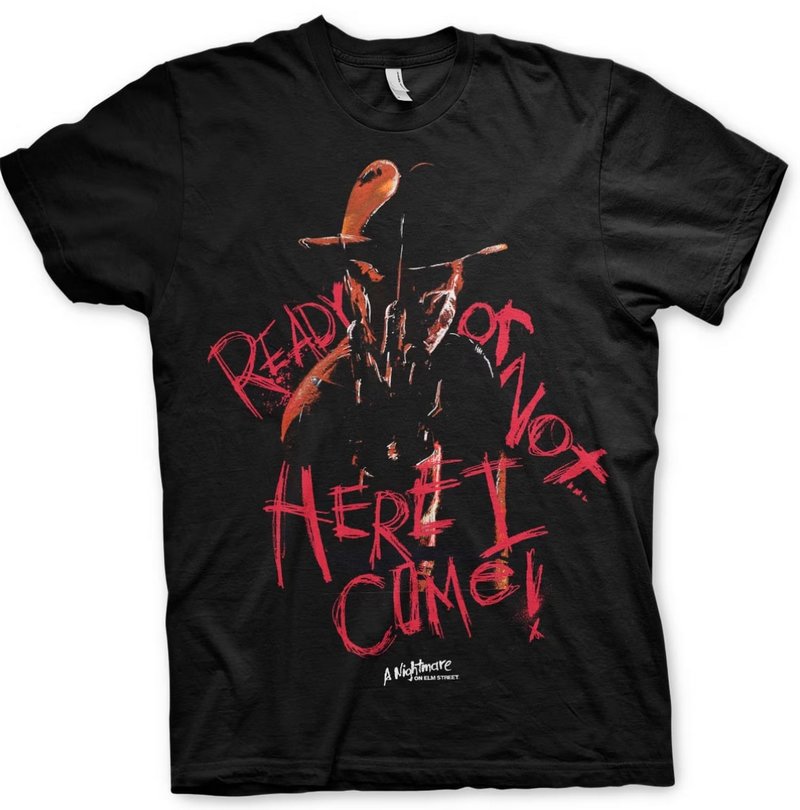 Oficiálně licencované hororové panské tričko Nightmare on Elm Street (Noční můra v Elm Street) - vrah Freddy Krueger. Triko je černé barvy a má krátký rukáv. Na tričku je nápis Ready or not here I come. Nezbytný doplněk do šatníku každého hororového fanouška.